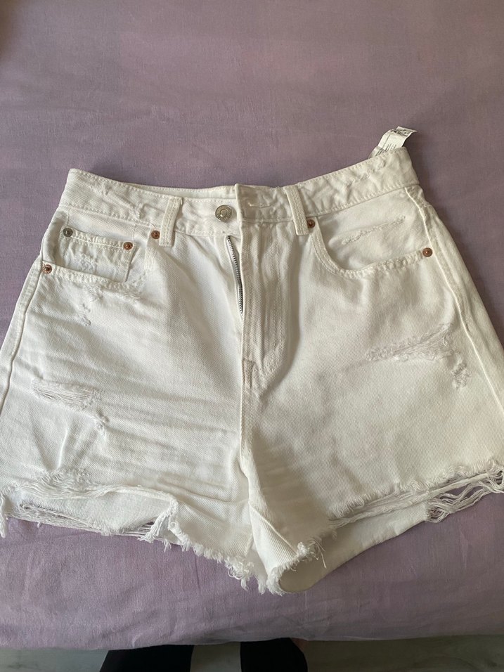 Beyaz mini denim şort, bol kesim ve kısa boyda. Hafif yıpranmış kenarlarıyla rahat ve şık bir görünüm sunar. Günlük kullanıma uygundur.