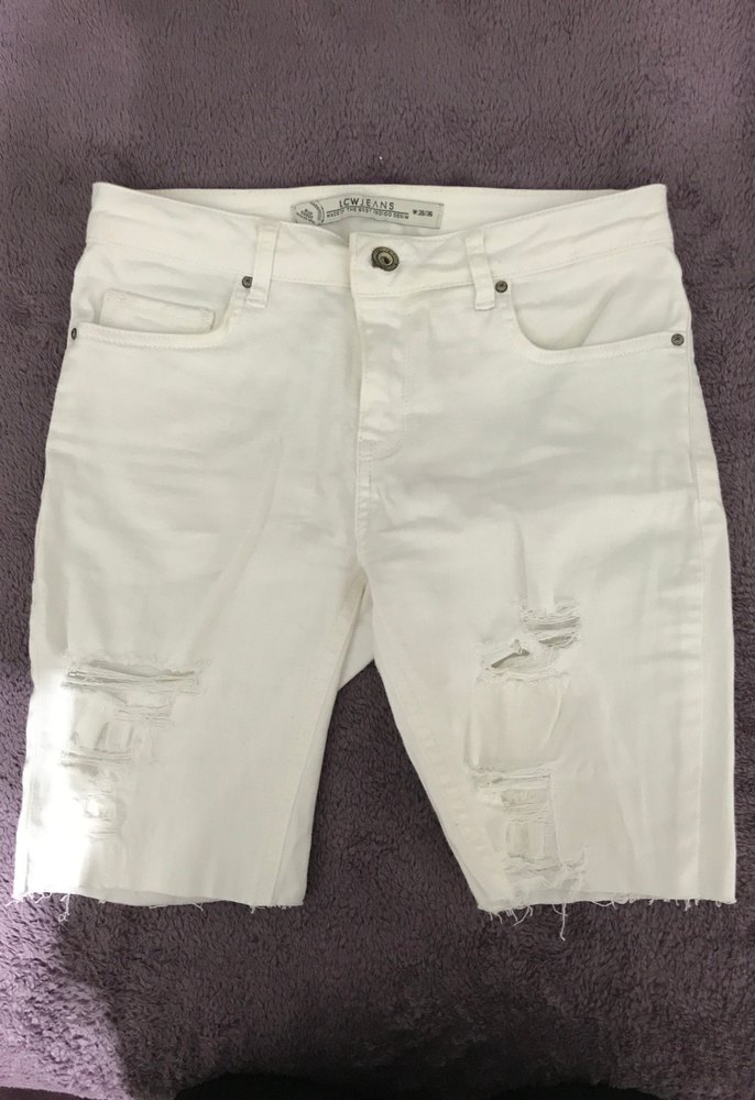 Pamuklu beyaz, fitted mini denim şort. Yırtık detaylarıyla rahat ve şık bir görünüm sunar. Günlük sokak stiline uygun. Aslında skinny pantolondu ama ben düz üstü kapri olarak kısalttım.