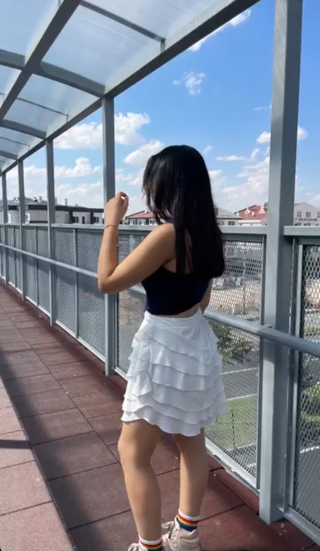 kat kat fırfırlı beyaz mini etek. Sokak stili ve açık hava kullanımı için uygundur. İki kez kullanıldı