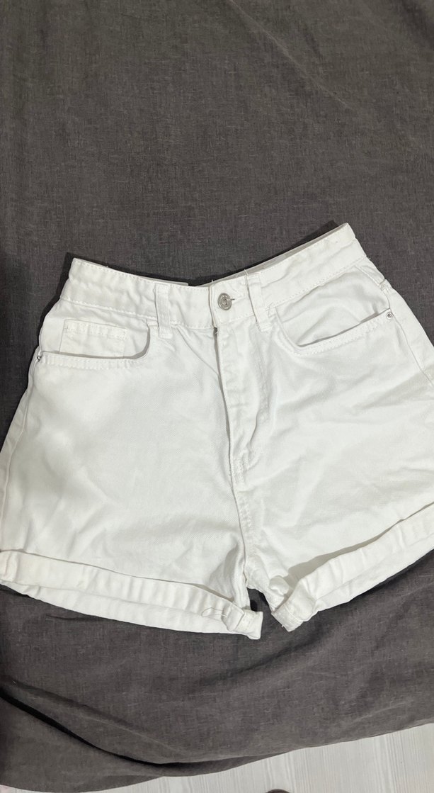 Yumuşak pamuktan üretilmiş, bol kesim, sade tasarımlı beyaz mini kot şort. Günlük rahat sokak stili için ideal.