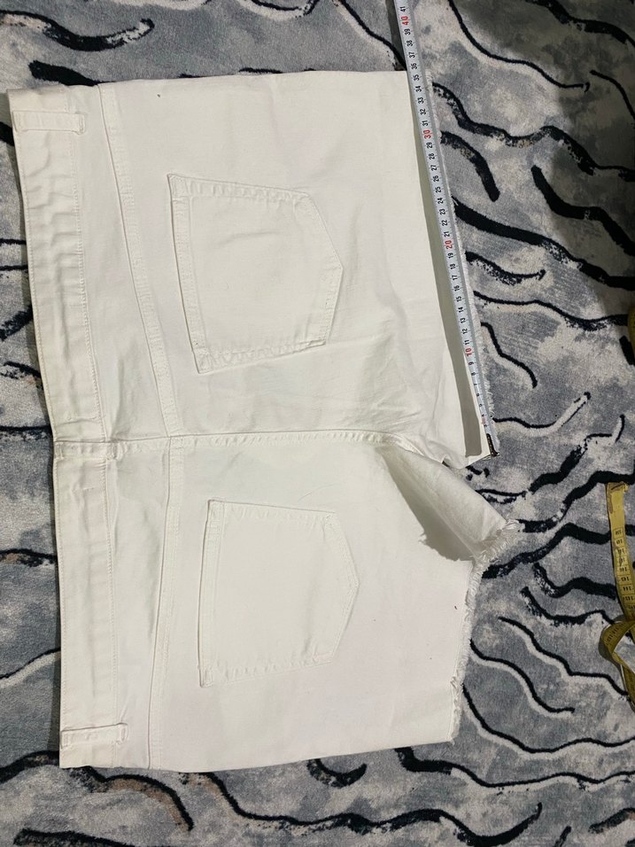 Düğmeli, bol kesim beyaz mini kot şort. İki arka cepli, sentetik kumaştan, sokak stili ve dış mekan kullanımı için uygun.