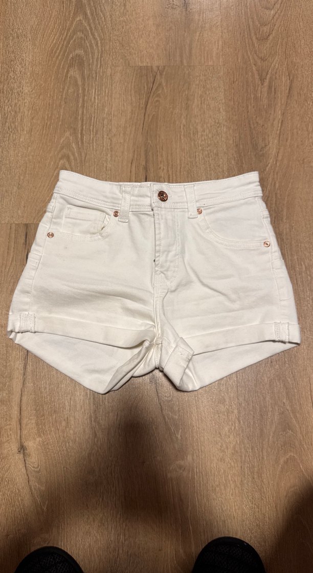 Pamuklu, beyaz mini denim şort, kısa kesim ve desensiz tasarım. Günlük sokak stili için rahat ve şık bir tercih. Bana dar geldiği için satışa çıkartıyorum hiç giymedim .