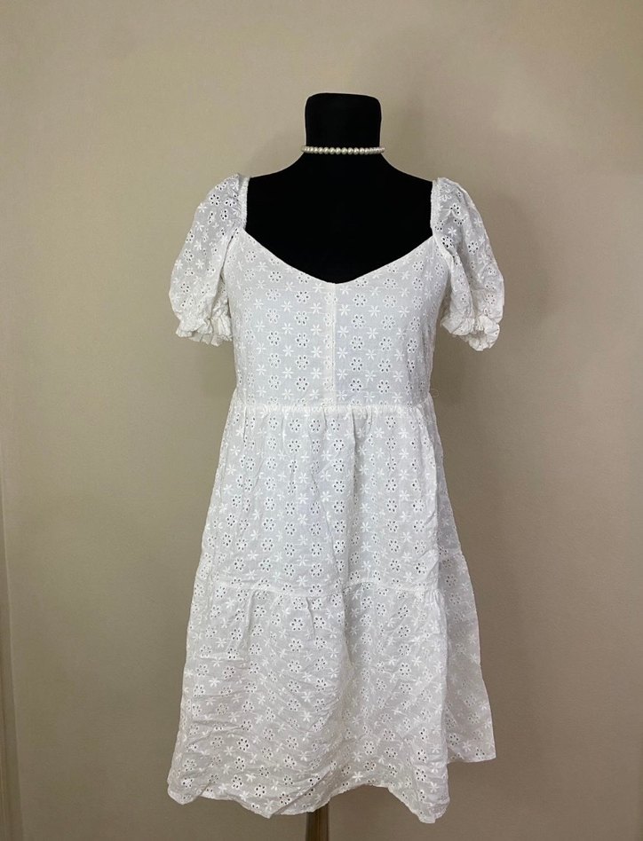 Beyaz nakışlı dantel detaylı, kısa balon kollu midi elbise. V yaka ve bol kesim, pamuklu yumuşak kumaştan, romantik akşamlar için ideal.
