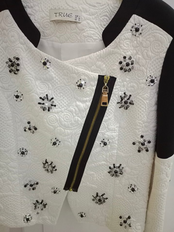 Beyaz, nakışlı ve parlak detaylara sahip kısa, dar kesim kadın ceketi. Asimetrik fermuarlı ve dokulu kumaştan, çağdaş Paris tarzını yansıtıyor. ✨ Markanın tek adet üretilen parçalarından biridir. Etek , elbise , pantolon her tarz ile kombini yapılabilen bir ürün. 1-2 sefer giyildi .