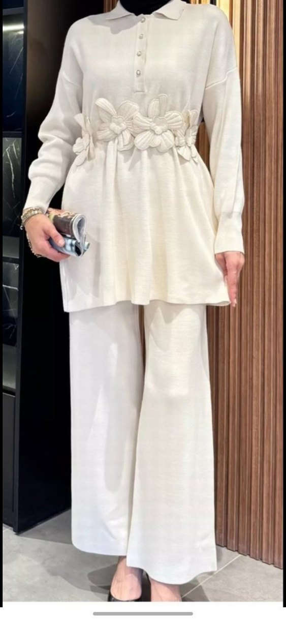 Kadınlar için uzun kesim, regular fit, uzun kollu ve yuvarlak yakalı beyaz, nakışlı takımdır. Kemer detayına sahiptir ve sentetik kumaştan üretilmiştir. Günlük kullanıma uygundur.