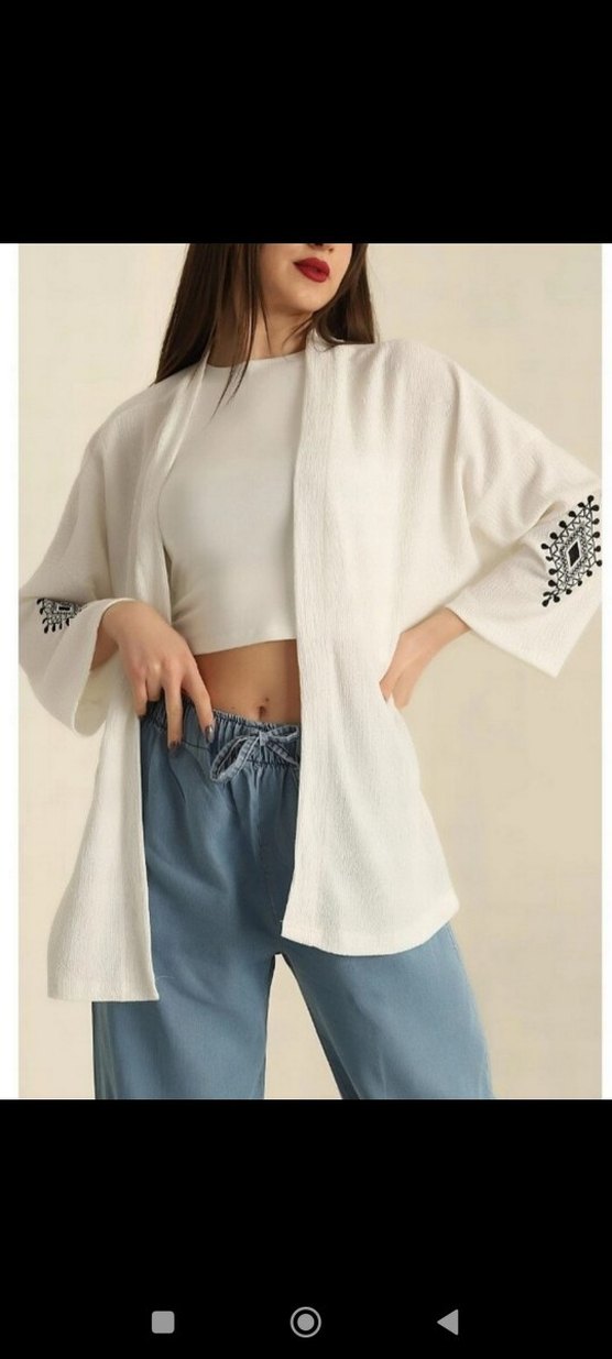 Pamuklu, uzun kollu, V yaka beyaz kimono. Kollarında nakış detayları ve salaş, drapeli kesimiyle günlük kullanıma uygun. s m beden