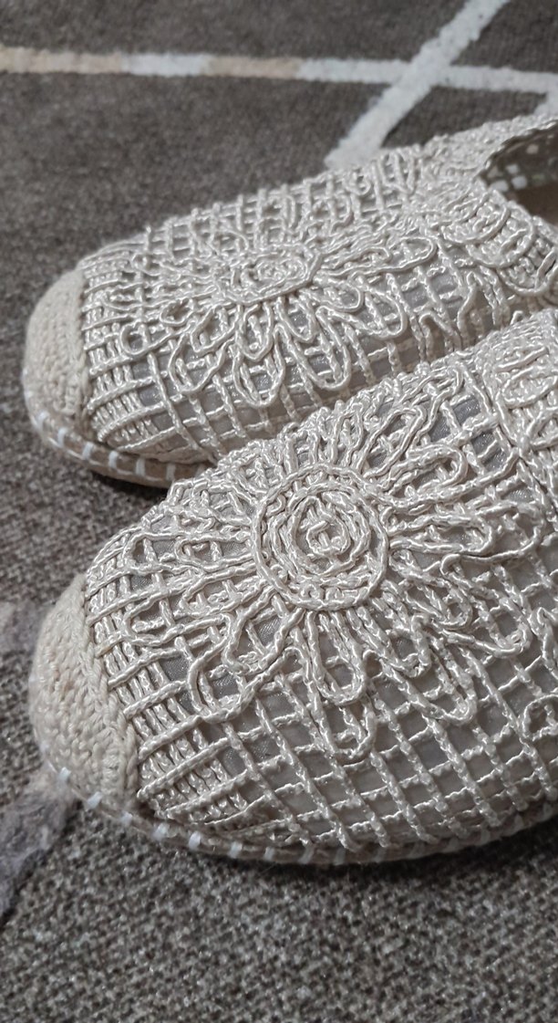 Beyaz örgü espadriller, dolgu topuklu, nakışlı desenler ve dantel detaylarıyla bohem tarzını yansıtır, günlük kullanım için uygundur.