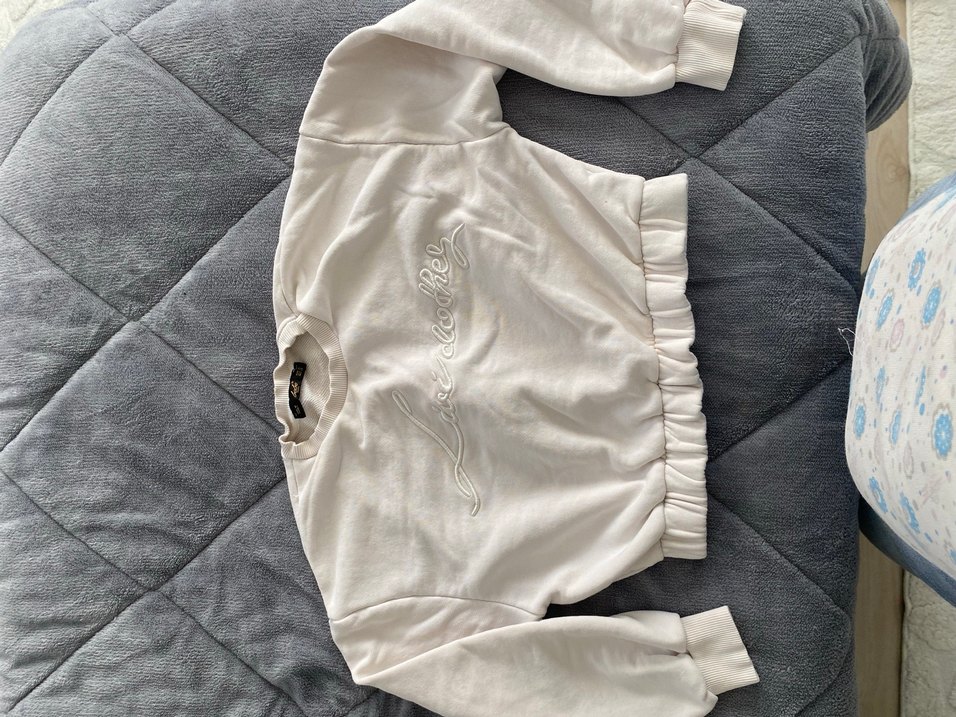 Pamuklu beyaz sweatshirt, bol kesim ve uzun kollu, nakış detaylı ve . Yuvarlak yaka ve kısa boydadır, günlük