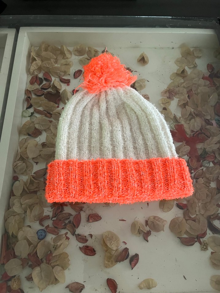 Kadınlar için örgü, beyaz gövde ve turuncu katman ile ponponlu, rahat ve renkli bir bere.