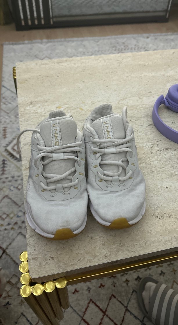 Beyaz Nike kadın spor ayakkabısı, blok topuklu ve bağcıklı tasarıma sahip, dayanıklı kauçuktan üretilmiştir. Spor ve trend sokak stili için uygundur.