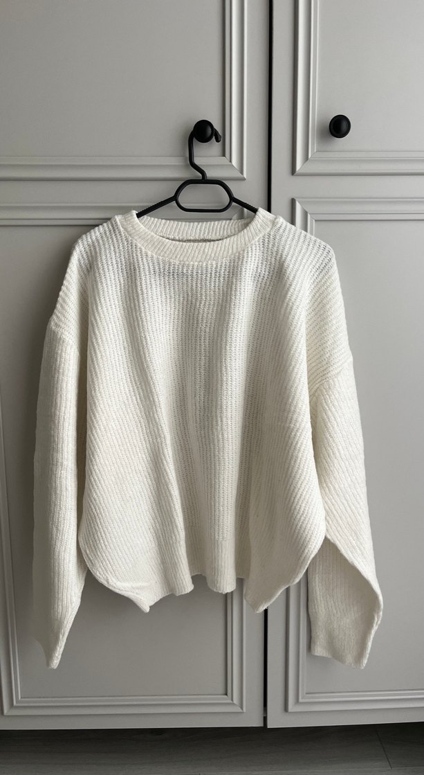 Kadınlar için uzun kollu, yuvarlak yaka, bol kesim beyaz örgü kazak. Yumuşak dokusu ve sade tarzıyla günlük kullanıma uygundur.