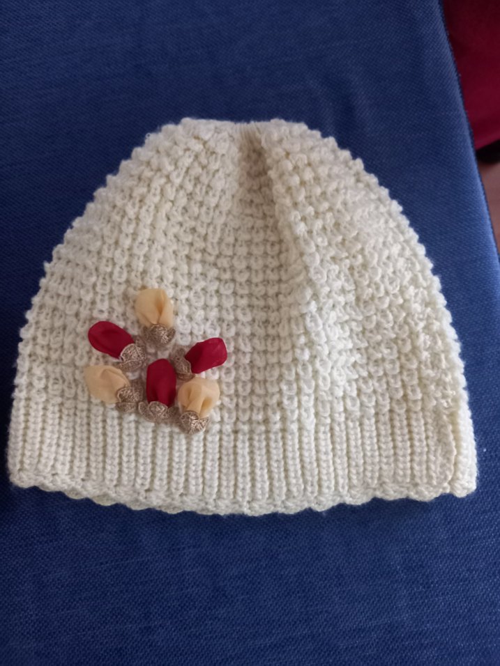 Yumuşak beyaz iplikten örülmüş kadın bere, renkli kumaş süslemeleriyle bohem tarz sunar. Sade ve rahat bir görünüme sahiptir.