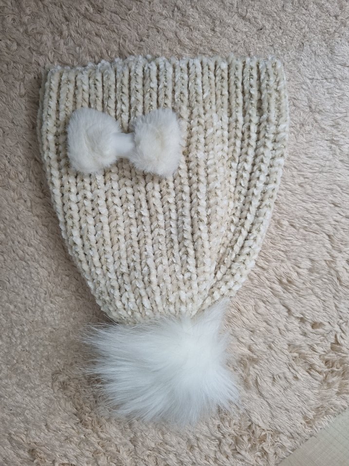 Kadınlar için beyaz örgü bere, yumuşak fiyonk ve kabarık ponpon ile bohem tarzda rahat bir tasarım sunar.