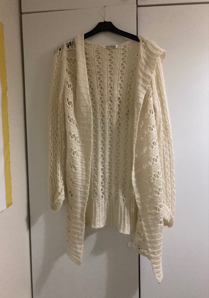Kadınlar için beyaz, örgü bohem tarzda, uzun kollu, salaş kesim ve yuvarlak yakalı hırka. Rahat ve günlük kullanıma uygun.