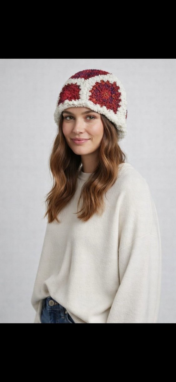 el emeği ölçüleri fotoğraflarda mevcuttur Kadınlar için beyaz renkte, örgü dokulu bohem ve retro tarzda bere. Rahat ve karşı kültür havası sunar.