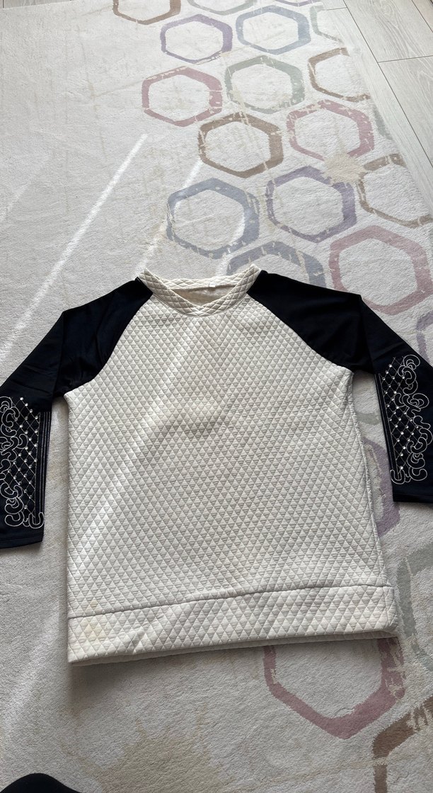 Kadınlar için uzun kollu ve yuvarlak yakalı, yumuşak sentetik kumaştan üretilmiş, örgü dokulu, beyaz gövde ve desenli siyah kollara sahip, günlük kullanıma uygun sokak stili sweatshirt. Tunik gibi