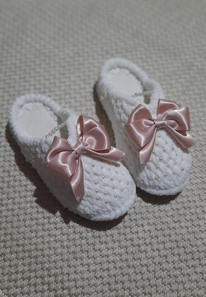 Kadınlar için beyaz örgü dolgu topuk terlik, işlemeli inciler ve pastel pembe saten fiyonk ile süslenmiş, rahat günlük kullanım için uygundur.