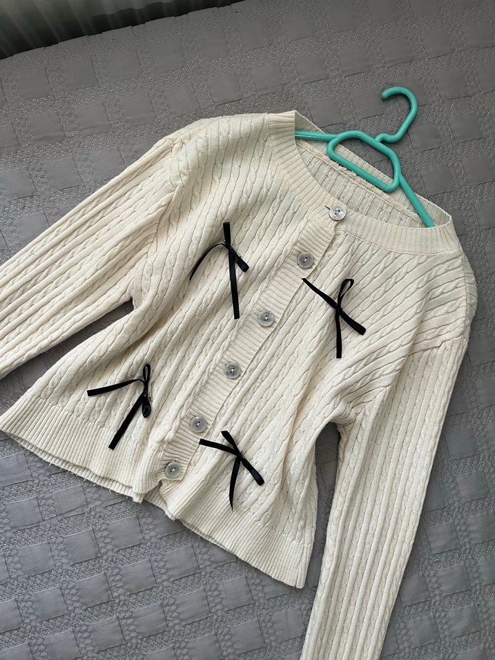 Kadınlar için beyaz, örgü triko hırka, düğmeli ve yuvarlak yakalıdır, küçük siyah fiyonk detaylarıyla günlük rahat stil sunar.