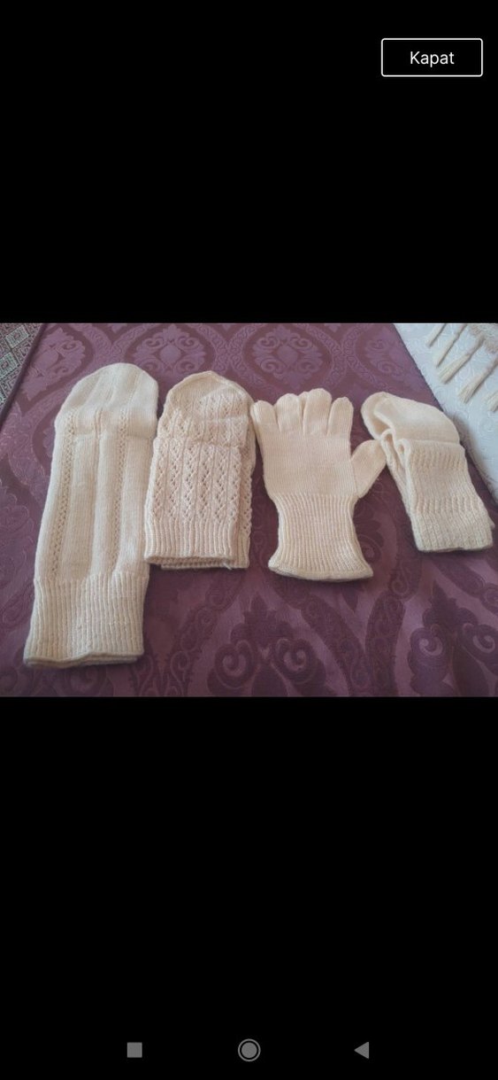 Yumuşak örgü kumaştan yapılmış, farklı geleneksel desenlere sahip beyaz kadın eldivenleri seti.