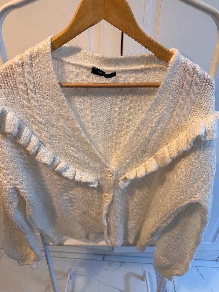 Beyaz örgü hırka, yakalı ve uzun kollu, bol kesim midi boyda. Bohem tarzda, yakada ince fırfır detaylarıyla rahat bir görünüm sunar.