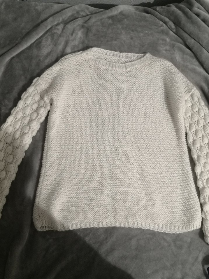 Kadınlar için yuvarlak yaka, uzun kollu, örgü dokulu beyaz kazak. Salaş kesim ve normal boyda, günlük kullanım için uygundur. Kollarda desenli, sade tasarım. Hiçbir sıkıntısı yok leke veya yırtığı yok dolabımda yer acicam o yüzden uyguna satıyorum