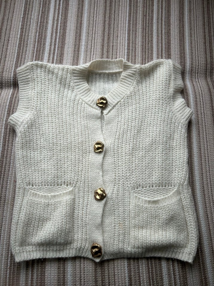 Önü cepli, düz örgüyle örülmüş, altın düğmeli, kolsuz beyaz yelek. Rahat kesim ve yuvarlak yaka ile günlük kullanıma uygun.