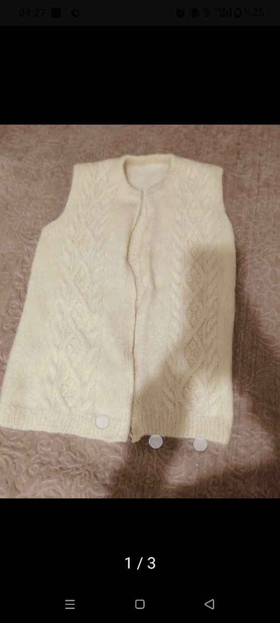 Kadınlar için kolsuz, yumuşak örgü dokulu, yuvarlak yaka ve normal kesime sahip beyaz yelek. Günlük rahat kullanım için ideal, sade ve orta uzunlukta bir parça.