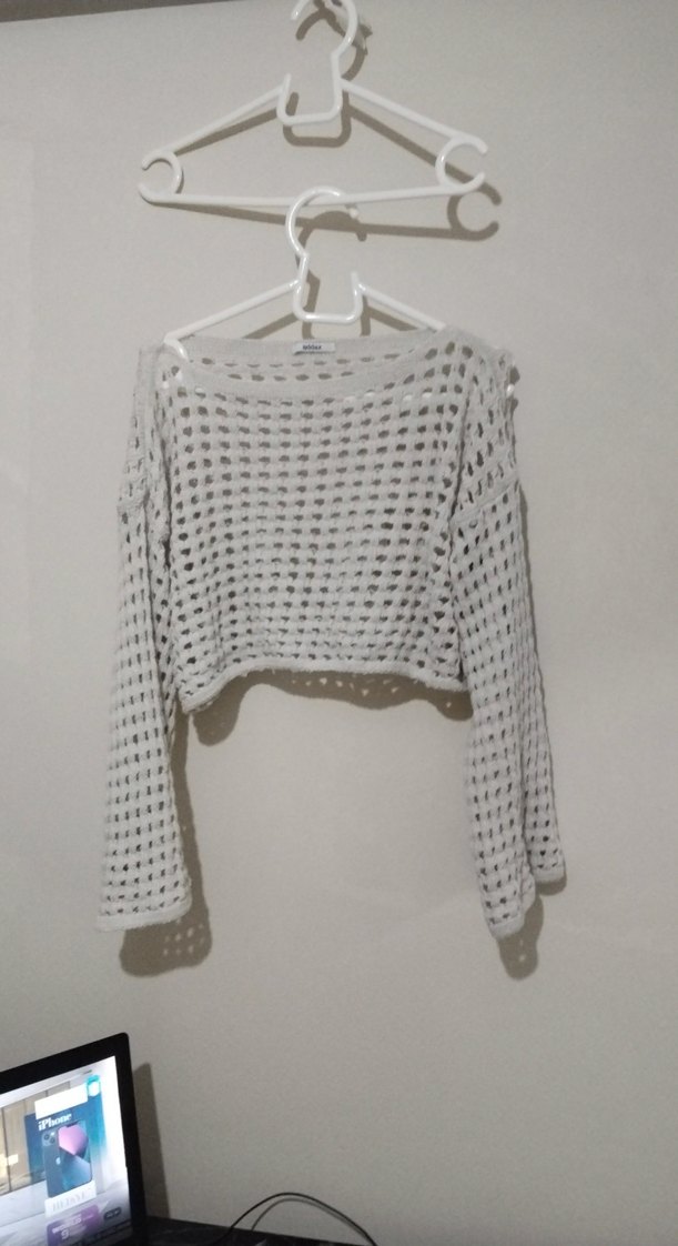 Kadın beyaz örgü mini kazak, uzun kollu ve salaş kesimdir. Kayık yaka ve örgü dokusu ile rahat bir his sunar.