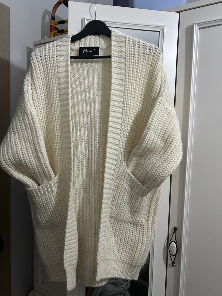 Beyaz örgü, uzun kollu, salaş kesim midi uzunlukta, çıtçıtlı yakalı, desen içermeyen kadın hırkası, günlük rahat kullanım için uygundur.