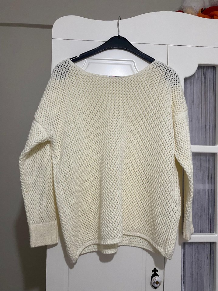 Kadınlar için beyaz renk, uzun kollu, yuvarlak yakalı, salaş kesim örgü kazak. Rahat ve desen içermeyen tasarımıyla günlük kullanıma uygundur.