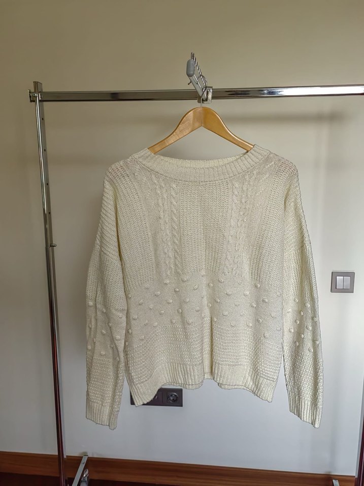 Kadınlar için beyaz, örgü kumaştan yapılmış, yuvarlak yakalı ve uzun kollu salaş bir kazak. Düz renk ve dokulu örgü detaylarıyla günlük kullanıma uygundur.
