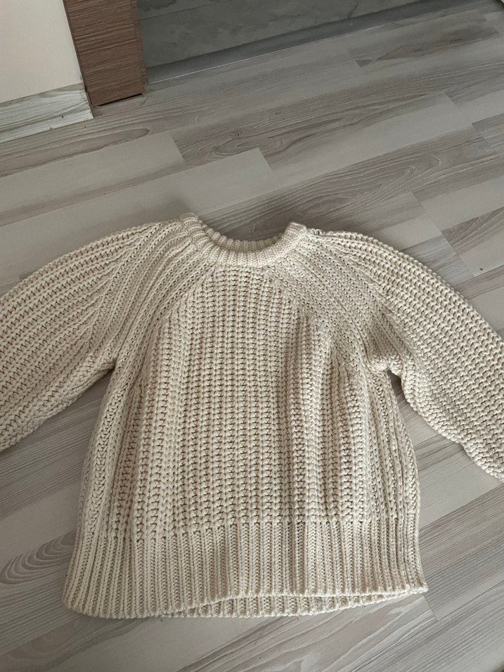 Kadınlar için beyaz renkte, örgü dokulu, yuvarlak yaka ve uzun kollu salaş triko. Normal boyda, rahat ve sade bir günlük kullanıma uygun.