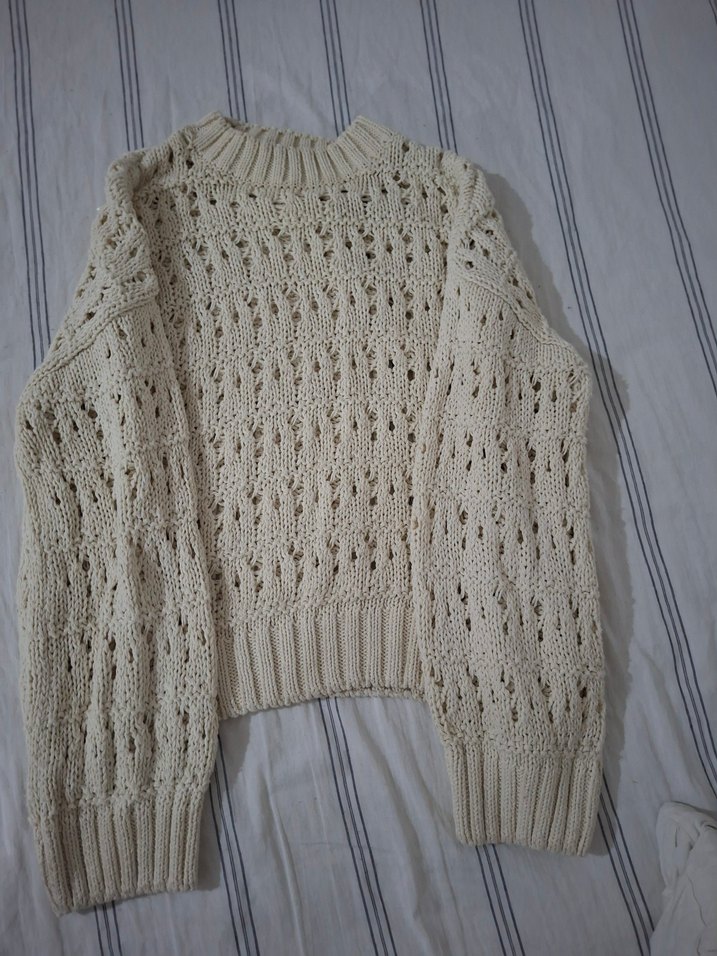 Uzun kollu, bisiklet yaka, beyaz örgü triko kazak, rahat ve gündelik kullanım için gevşek kesim ve sade tasarıma sahiptir.