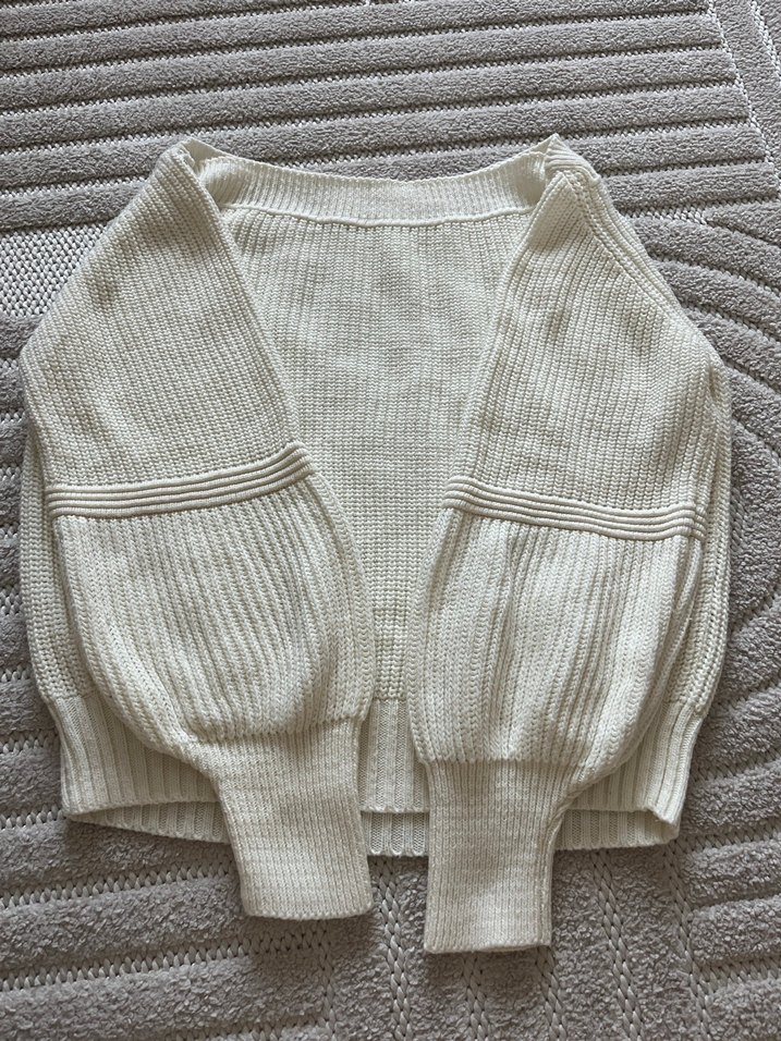 Kadın beyaz örgü kazak, tek renk, uzun ve bol kollu, tekne yaka, normal boyda, rahat kesimdir. S/M uyumlu