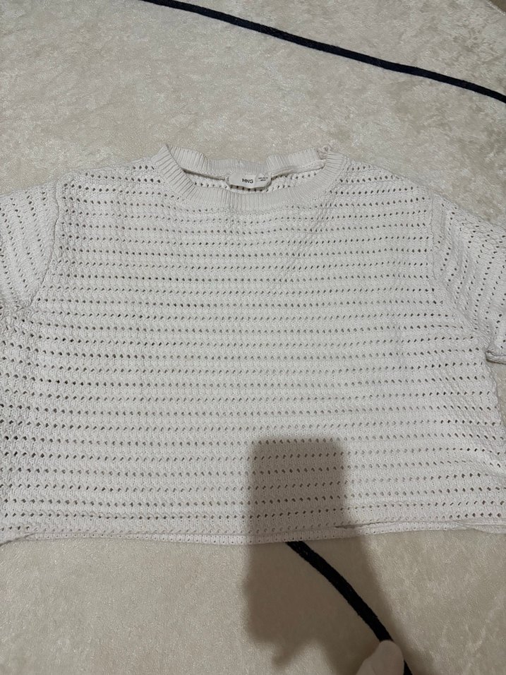 Kadınlar için beyaz, örgü dokulu uzun kollu, yuvarlak yakalı, salaş kesim kazak. Dış mekan kullanımı için uygundur.