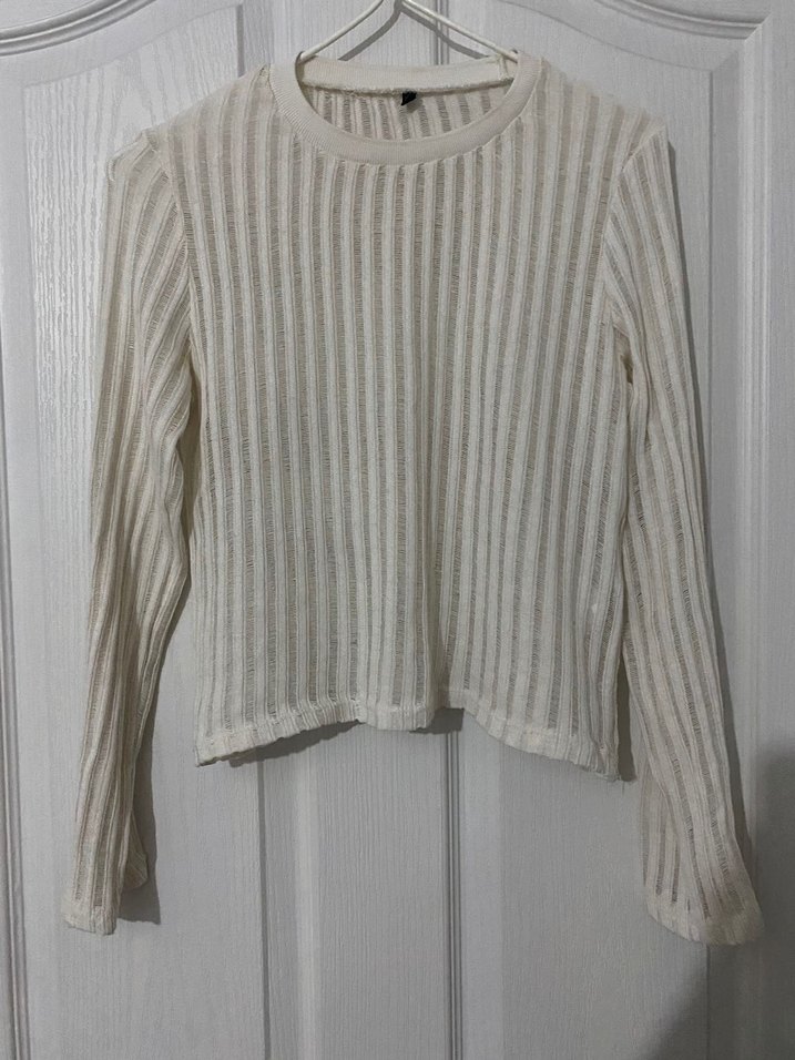 Kadınlar için örgü dokulu, uzun kollu, yuvarlak yakalı keten kazak. Rahat ve bol kesim, midi boyda, günlük sokak stiline uygun hafif beyaz renkli.