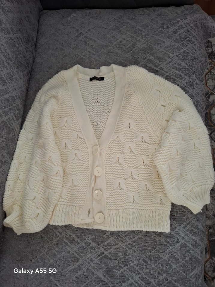 Beyaz renkli, V yaka, uzun kollu, midi boy örgü hırka. Rahat kesimi ve düğmeli önü ile bohem tarzda günlük kullanım için uygundur.