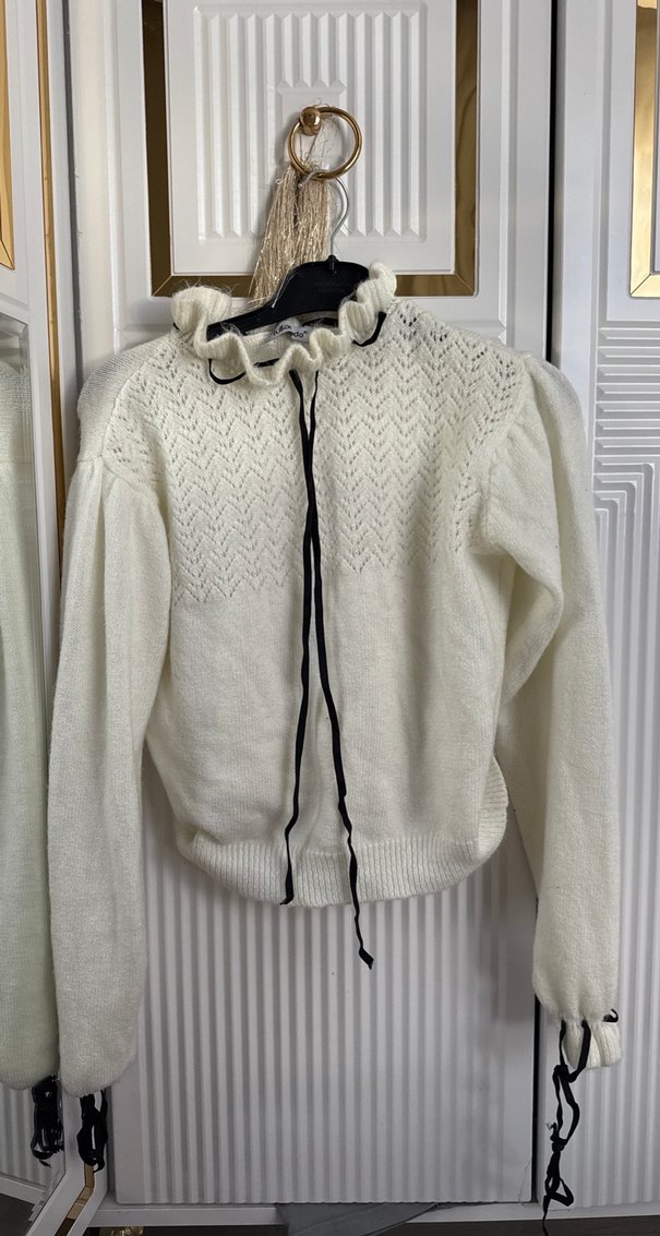 Kadın beyaz örgü kazak, yüksek yakada fırfır detaylı ve bol kesimdir. Uzun kollu, desensiz ve yumuşak örme kumaştan yapılmıştır. Günlük sokak stiline uygun, Paris esintili.