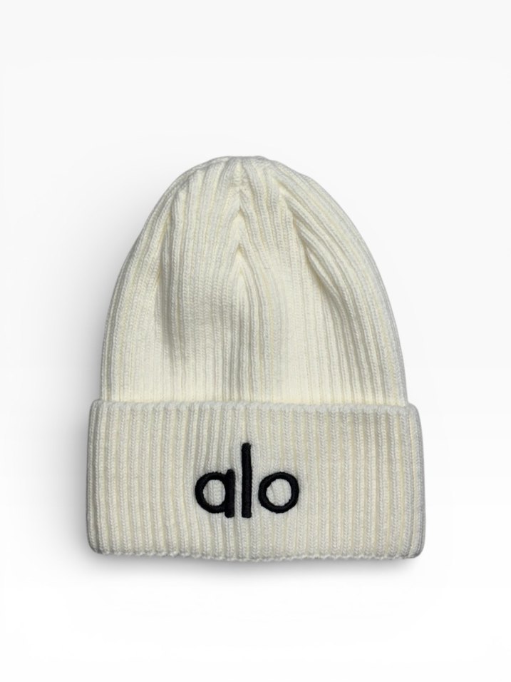 Kadınlar için beyaz örgü yün bere, rahat ve sade sokak tarzı. Önünde "alo" işleme detayı bulunur.