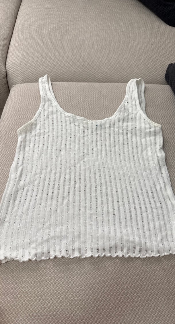 Nefes alabilir kumaştan, kayık yaka ve bol kesimle beyaz örgülü askısız kadın atlet. Hafif koltuk altı renk değişimi var