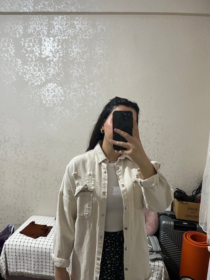 Kadın beyaz oversize denim ceket, uzun kollu ve pamuklu kumaştan. Notlu yaka detayıyla gündelik ve rahat bir şıklık sunar.