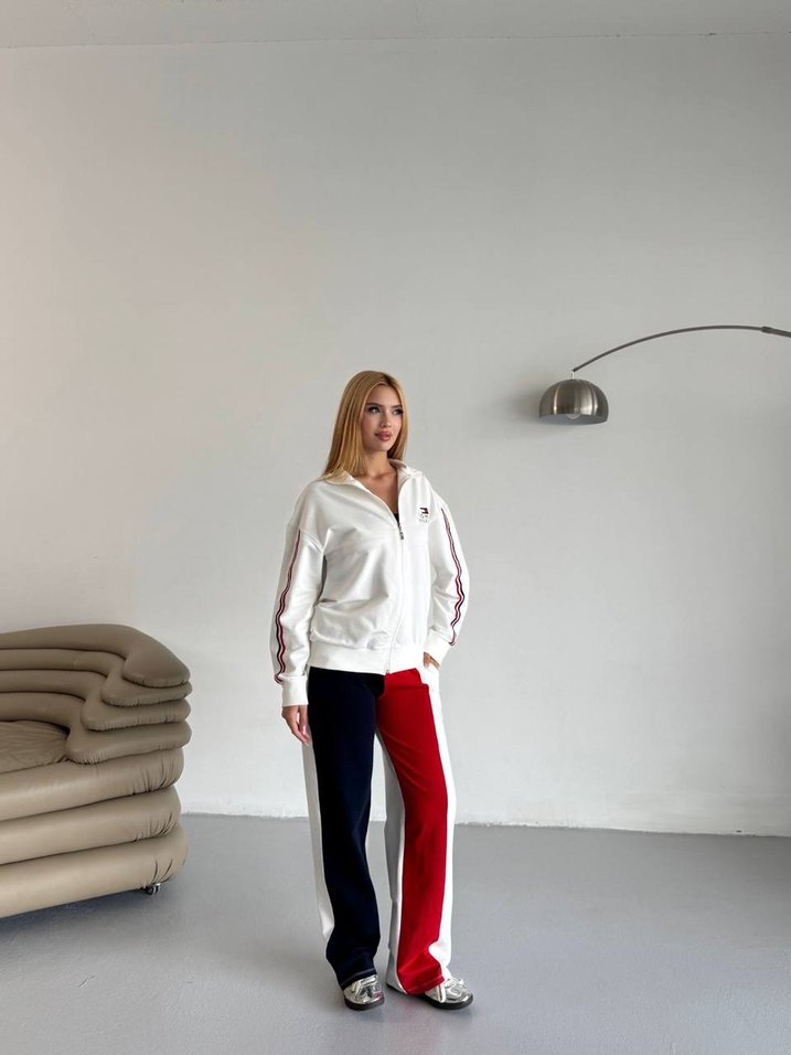 Kadınlar için beyaz, oversize kesim eşofman üstü, uzun kollu ve bisiklet yakalıdır. Kırmızı ve lacivert parçalı pantolonla rahat ve şık bir görünüm sunar. Yumuşak kumaştan üretilmiştir. ♀️SML XL bedenleri mevcuttur Diz izi pamuklama yapmaz yıkama sorunu yok kırışmaz kumaş
