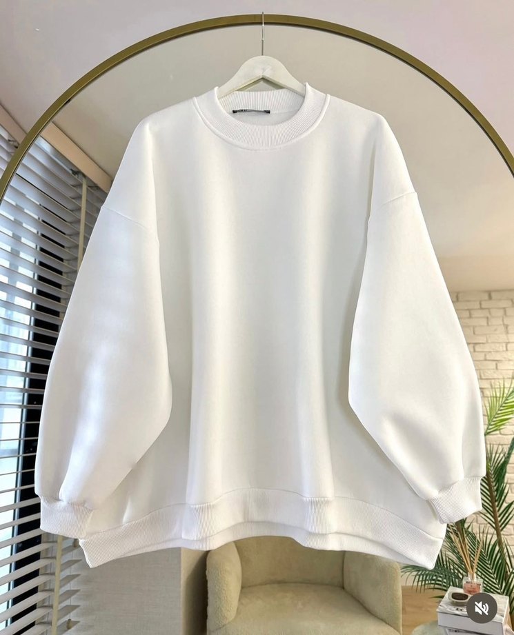 Bu beyaz bisiklet yaka sweatshirt, uzun kollu ve bol kesimdir. Yumuşak pamuktan üretilmiş, günlük kullanım için minimal ve rahat bir stil sunar.
