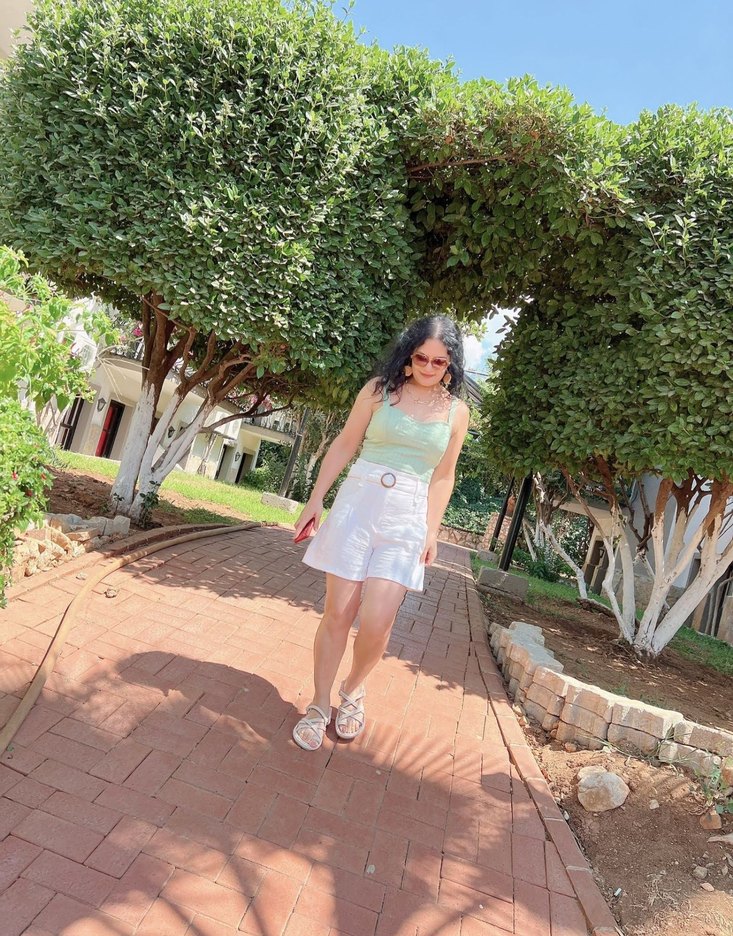 Kadınlar için kısa, bol kesim Bermuda şortlar, yumuşak pamuk kumaştan yapılmış ve rahat dış mekan kullanımı için uygun. 1 kez giyildi