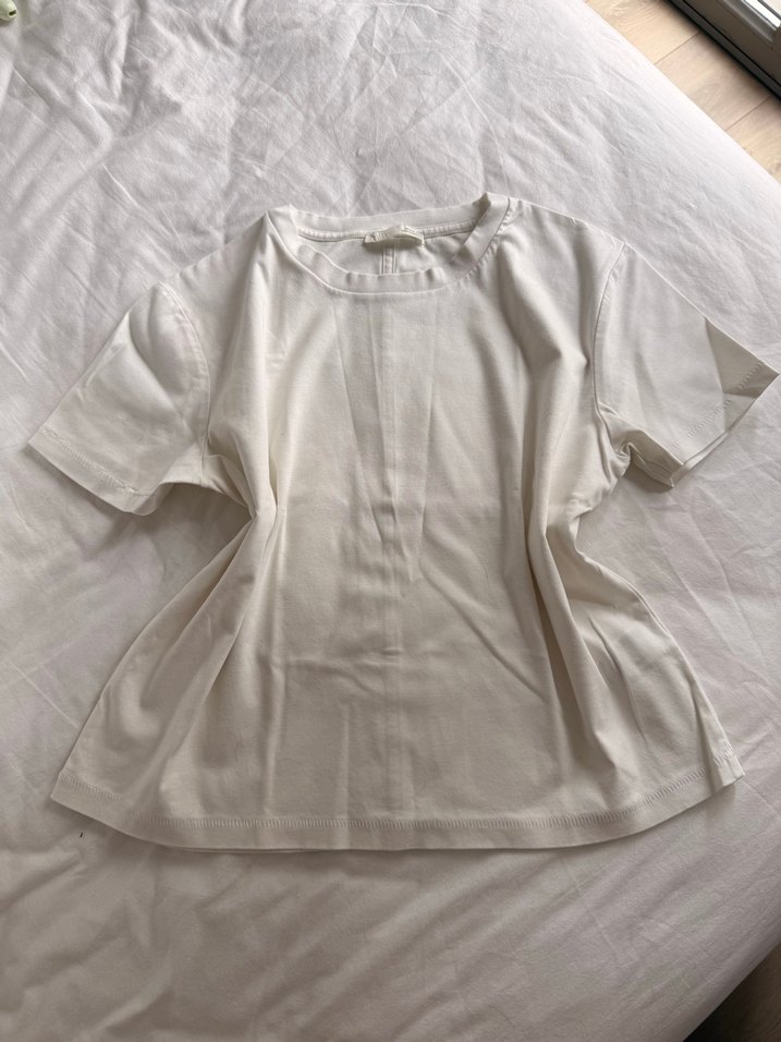 Beyaz pamuk kumaştan kısa kollu, yuvarlak yakalı, bol kesim kadın tişörtü. Minimalist ve rahat günlük kullanım için uygundur.
