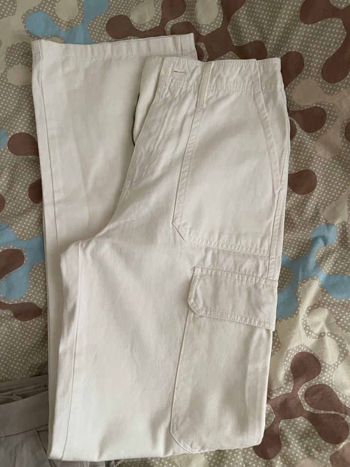 Günlük kullanım için rahat kesim, midi boy, beyaz pamuk kumaş pantolon, sade ve şık bir sokak stili sunar.