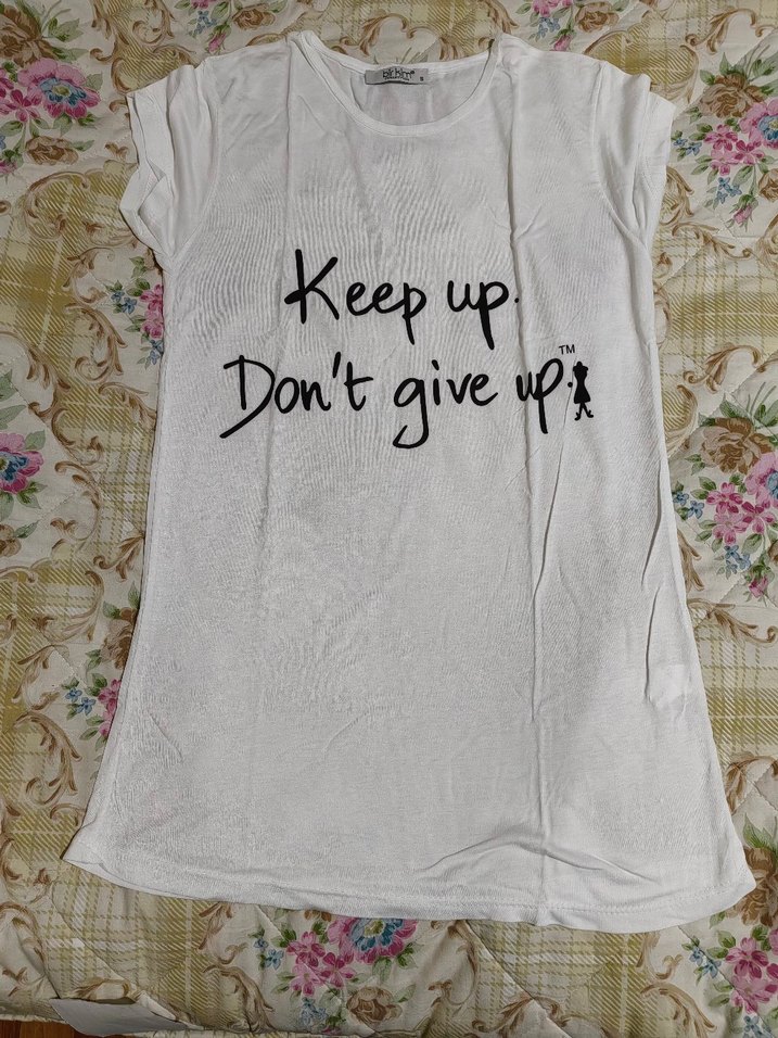 Kadın beyaz pamuk tişört, kısa kollu ve salaş kesimlidir. Üzerinde "Keep up, Don't give up" yazılı baskı Sokak tarzına uygun.