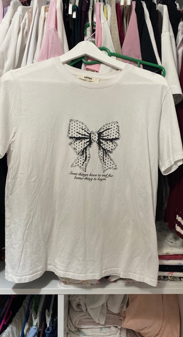 Kadınlar için beyaz pamuklu tişört, baskılı fiyonk deseni ve yuvarlak yaka ile. Kısa kollu, bol kesim ve günlük rahat kullanım için uygundur.