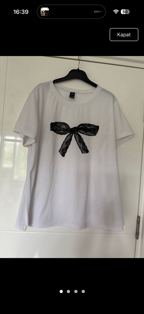 Beyaz pamuklu tişört, önünde siyah baskılı fiyonk detayı ile rahat kesime sahip. Kısa kollu ve yuvarlak yakalı, günlük sokak stili için uygun.