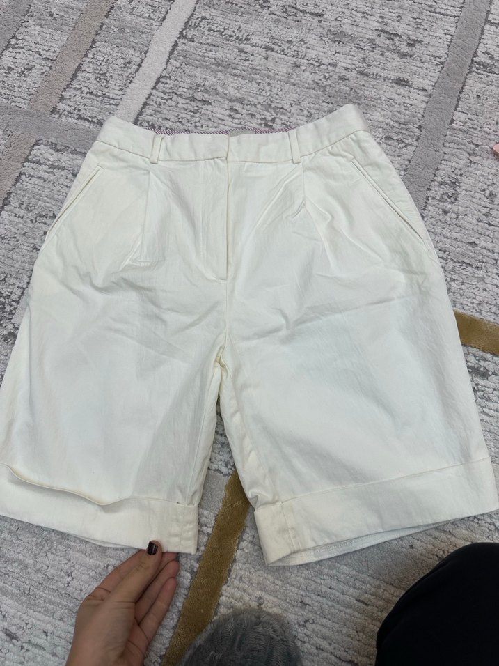 Pamuklu, bol kesim, beyaz renkli kısa bermuda şort. Sokak stiline uygun, desen içermeyen rahat bir tasarım.